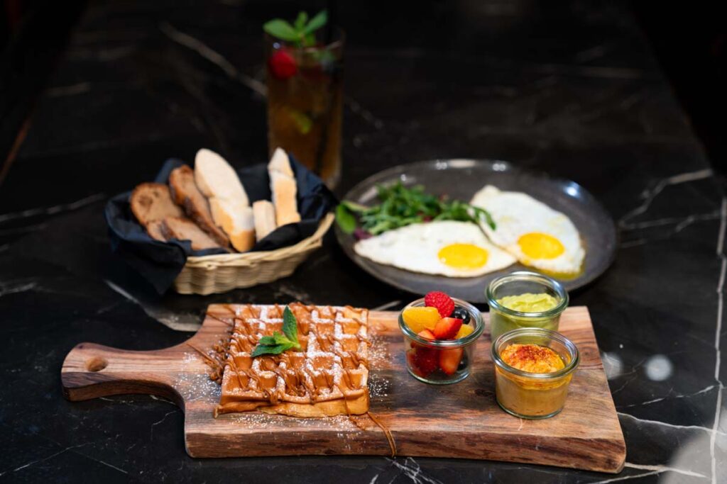 Bio Spiegeleier - Waffel - Avo Dip - Hummus Dip - frische Früchte - Brotkorb - Eistee nach Wahl